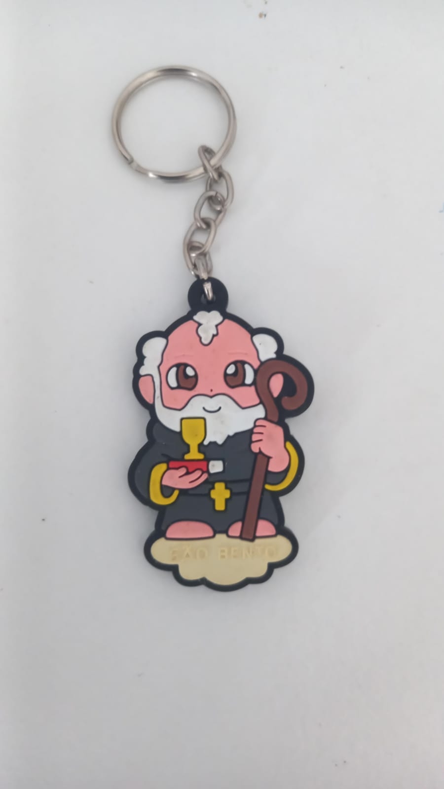 O chaveiro emborrachado de São Bento é perfeito para quem busca um acessório prático e cheio de estilo.